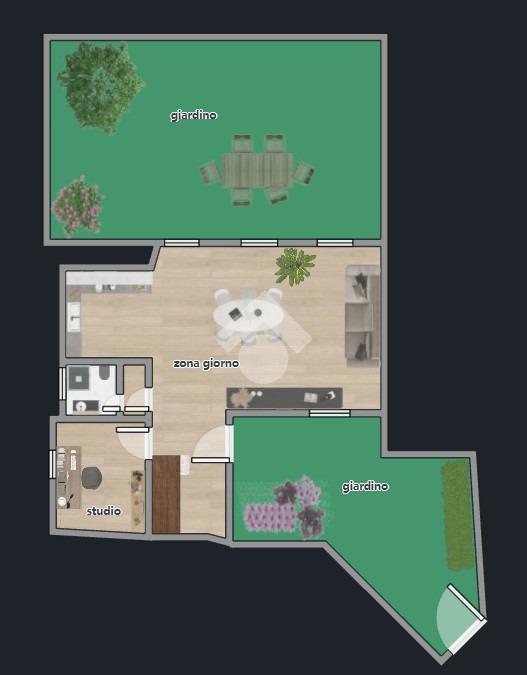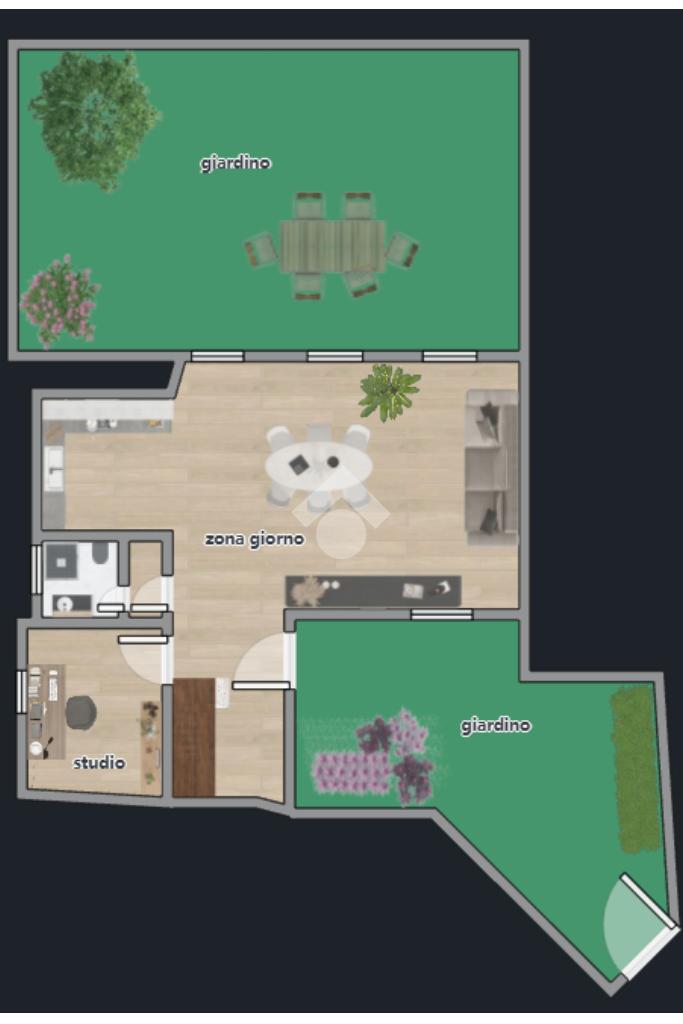 L’ingresso accompagna alla zona giorno ampia e luminosa, caratterizzata da una cucina a vista e da grandi porte finestre che donano luce naturale e permettono l’accesso diretto al giardino sul retro, ideale per momenti di relax all’aperto e dotato di entrata secondaria.