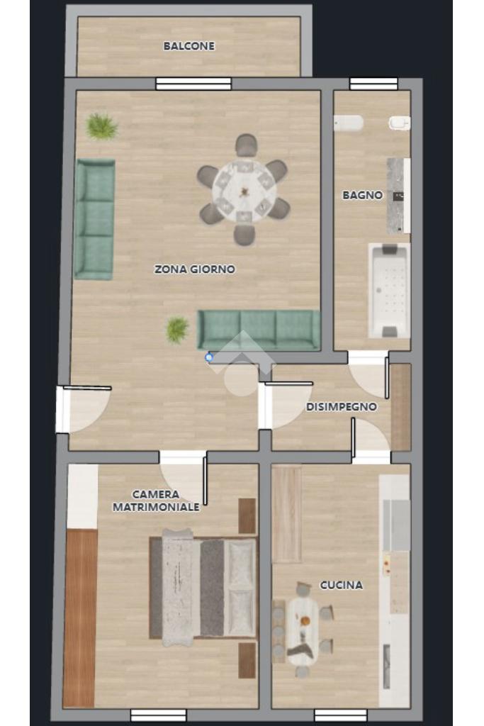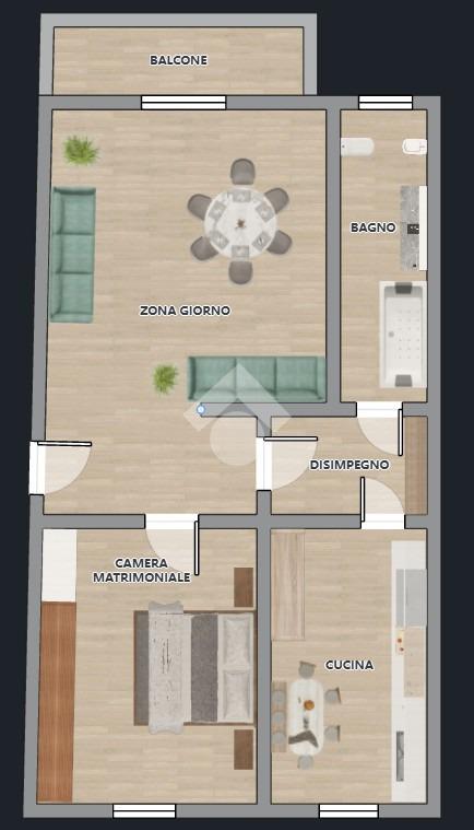 L’ingresso accoglie la zona giorno con uno spazio arioso e luminoso, dal quale si accede direttamente al balcone, ideale per godere di un piacevole affaccio esterno. La camera matrimoniale, di generose dimensioni, garantisce comfort e versatilità negli arredi.