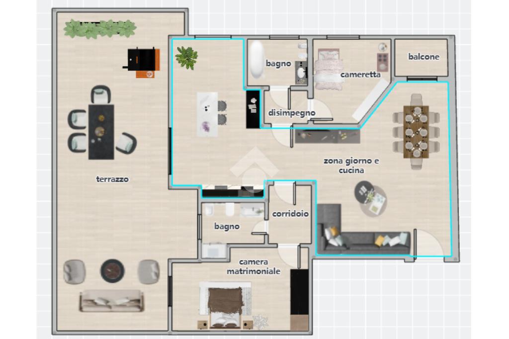 L’immobile si apre su un ampio ingresso che conduce direttamente alla zona giorno, luminosa e spaziosa, dotata di porta finestra con accesso al balcone. Da qui si accede alla cucina abitabile, con affaccio sul terrazzo pavimentato di 50 mq attrezzato con pergolato rimovibile e tendaggio elettrico. Ideale per momenti di relax all’aperto.