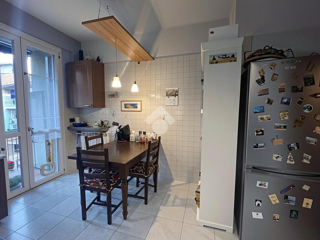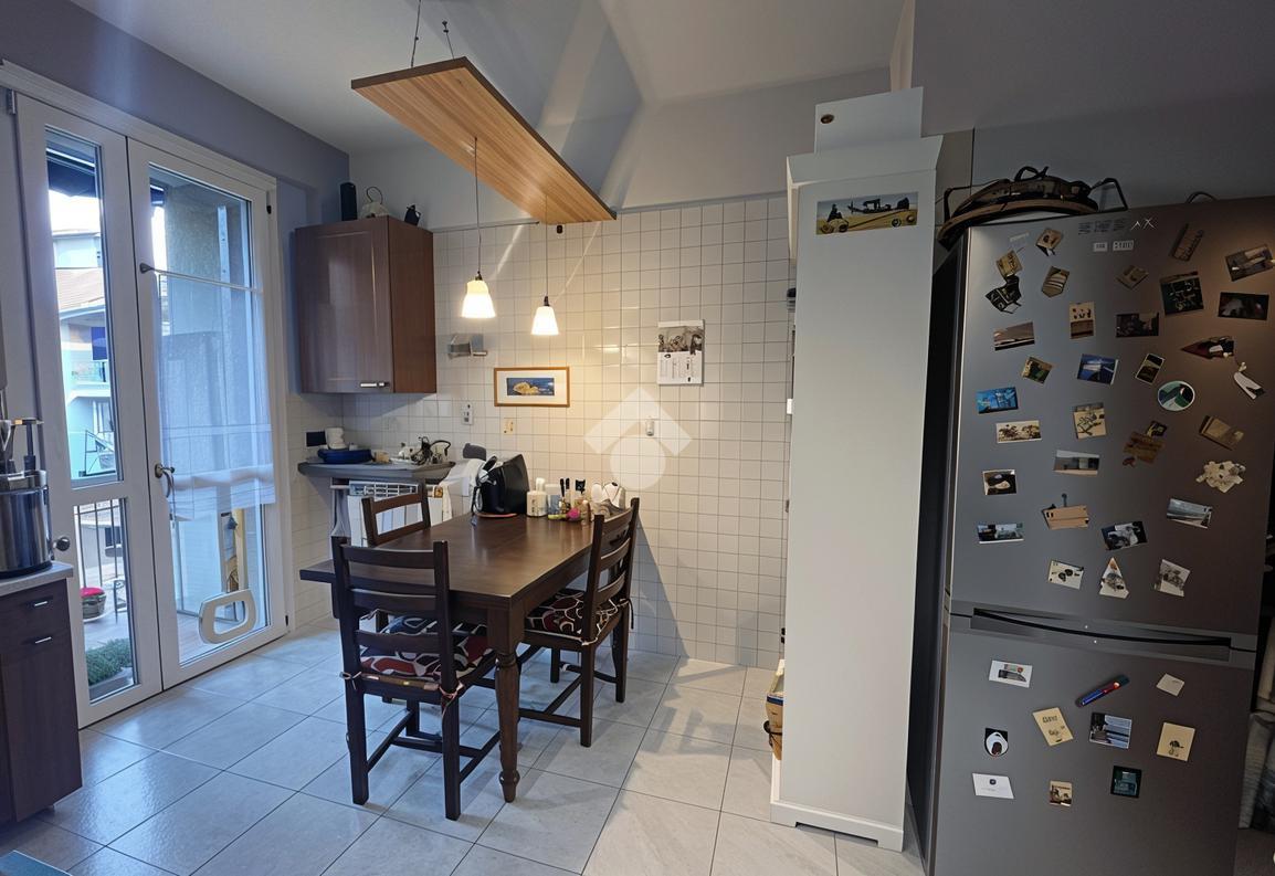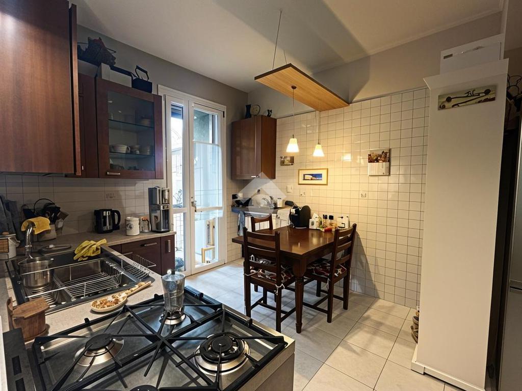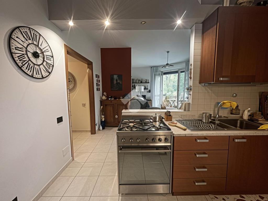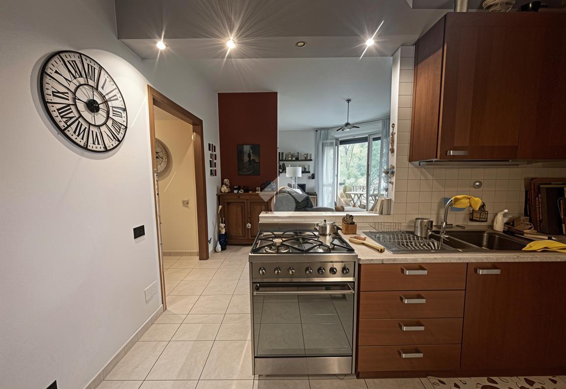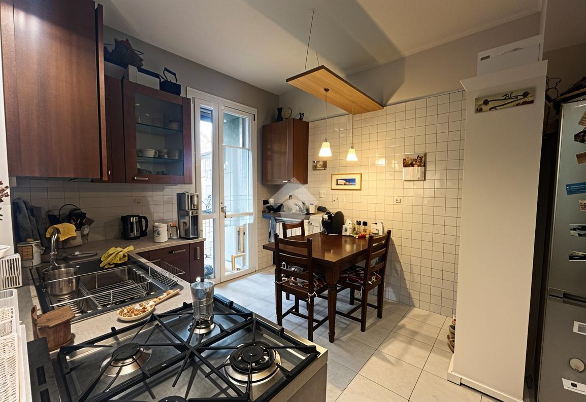 L’ingresso introduce in una luminosa e ampia zona giorno, uno spazio accogliente pensato per la vita quotidiana e per i momenti di convivialità grazie anche alla presenza della stufa a pellet. Da qui si accede al balcone con affaccio sul verde condominiale, un piacevole angolo di tranquillità e relax dove potersi concedere una pausa e godere di un’atmosfera riservata. La cucina è a vista e ben integrata nella zona living; dispone inoltre di un pratico balconcino di servizio dove è presente un comodo lavandino esterno, ideale per le attività domestiche.