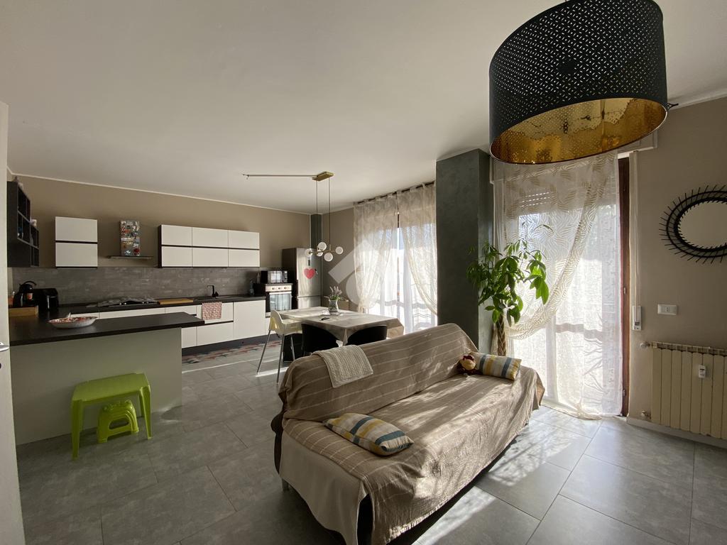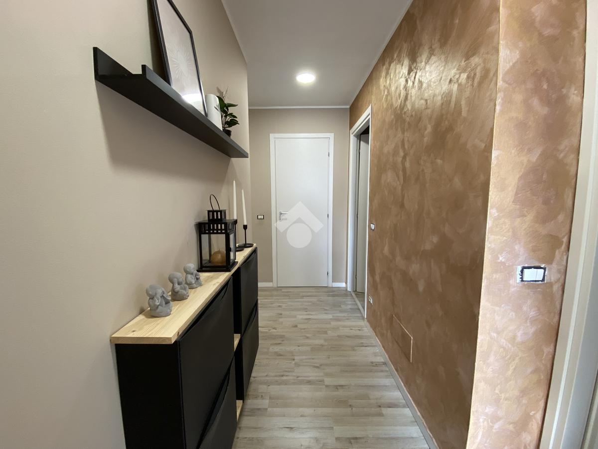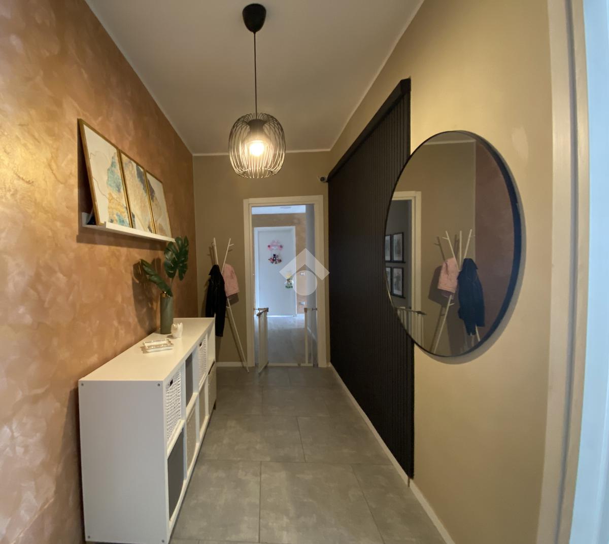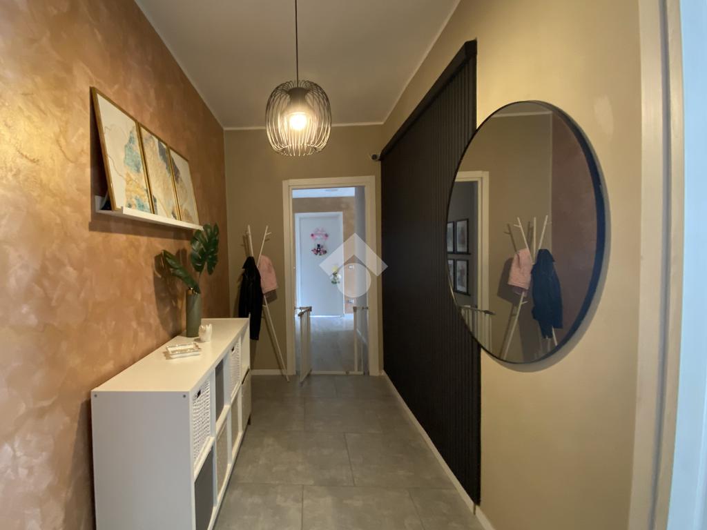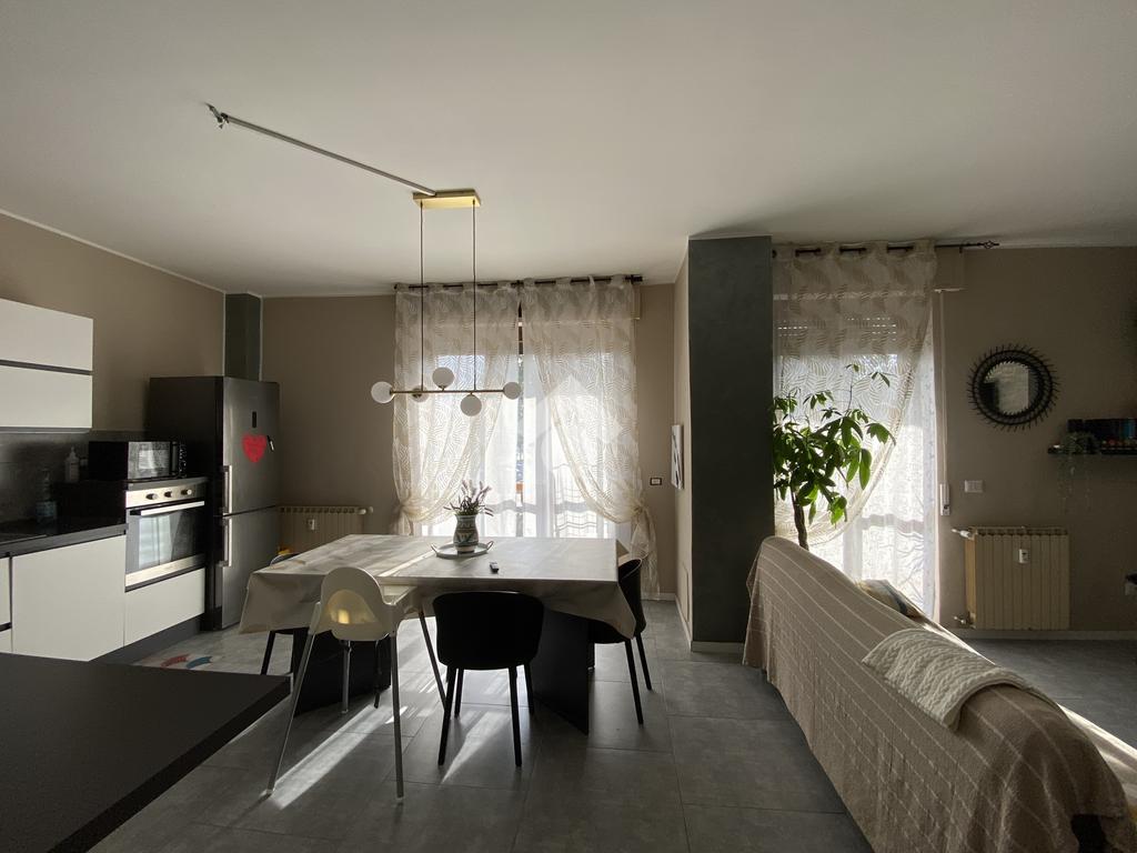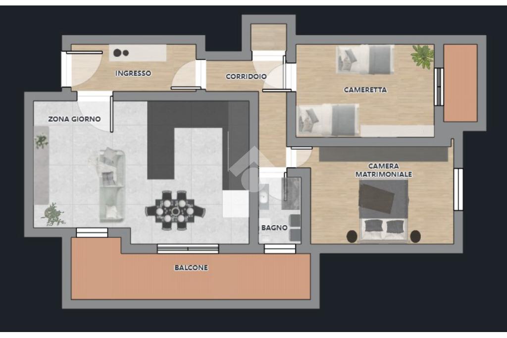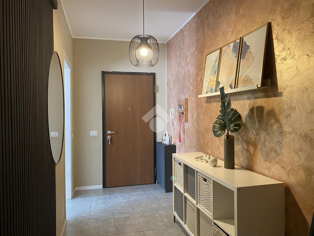 L’abitazione si apre su un ingresso accogliente che conduce all’ampio e luminoso soggiorno con cucina a vista, perfettamente integrata e con accesso diretto al balcone, ideale per momenti di relax all’aperto.