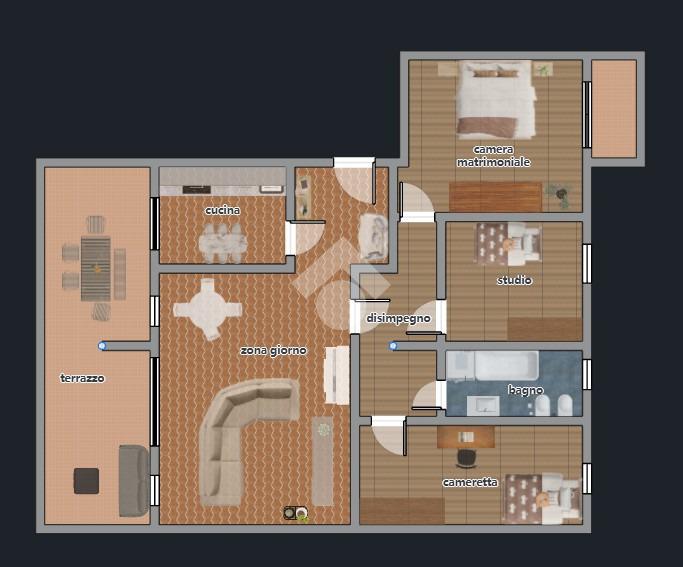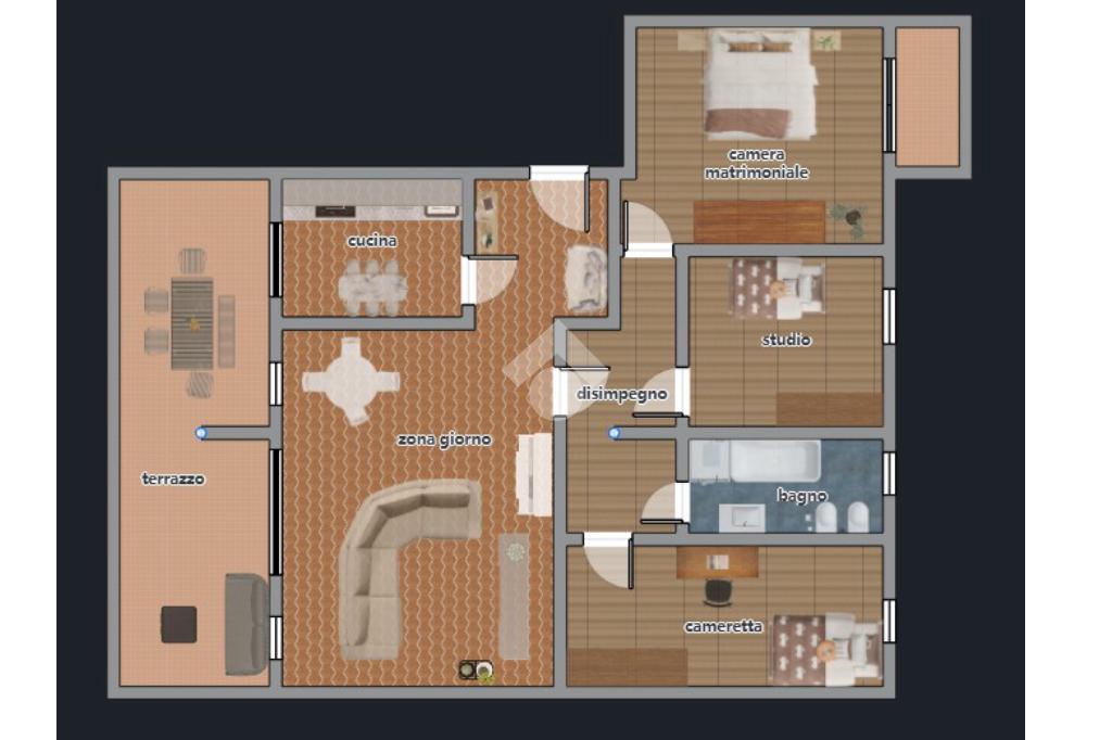 La zona notte si compone di una camera matrimoniale con balcone, una cameretta spaziosa e una terza stanza perfetta come seconda cameretta o studio, a seconda delle proprie esigenze. Completa la zona notte un bagno finestrato, dotato sia di doccia che di vasca, pensato per offrire il massimo comfort quotidiano.